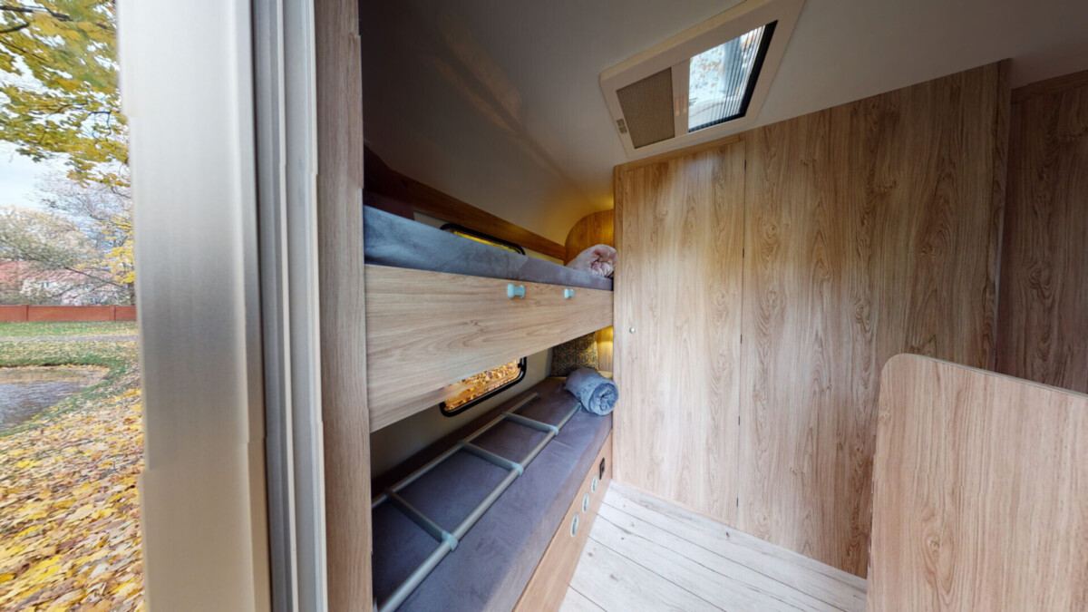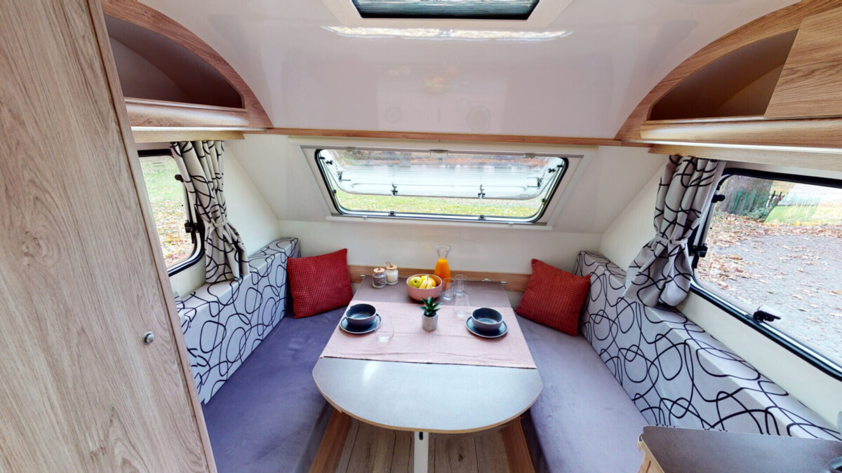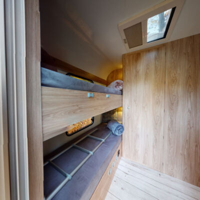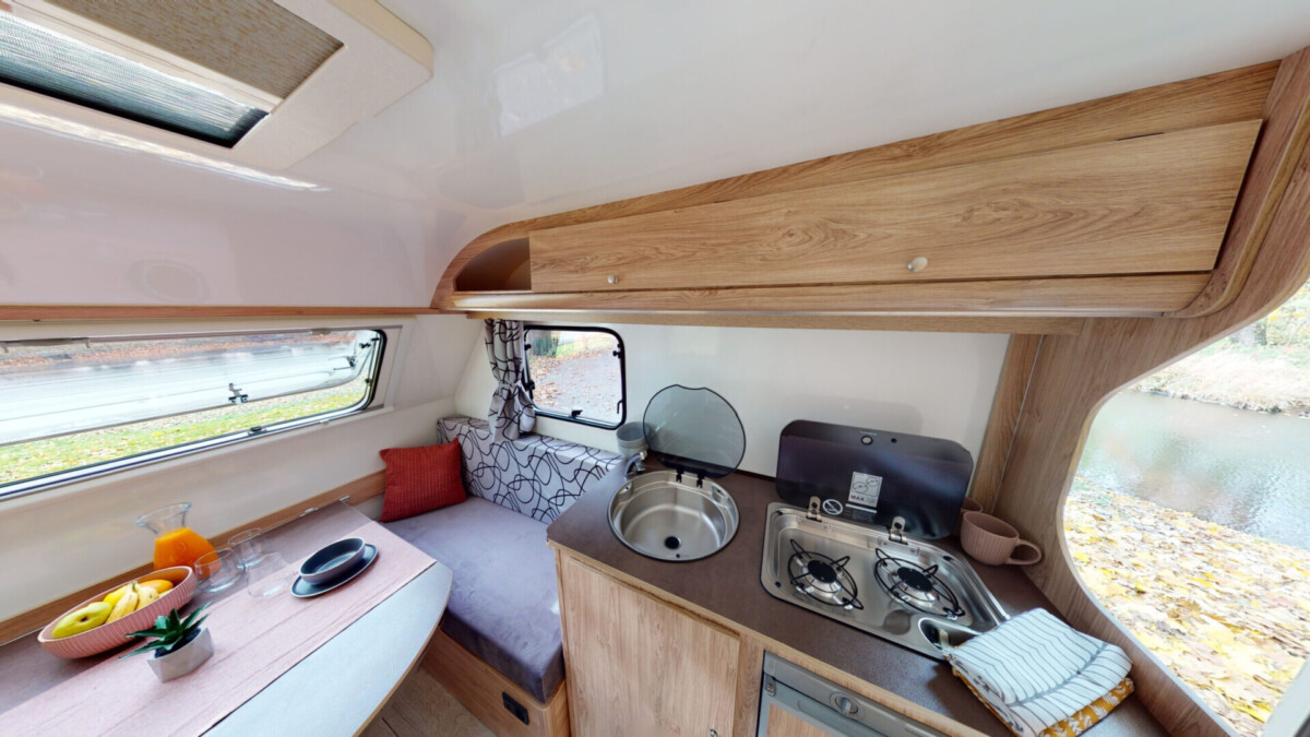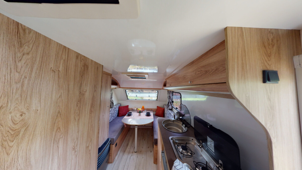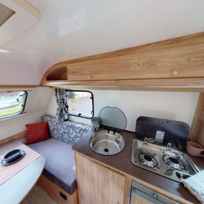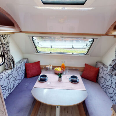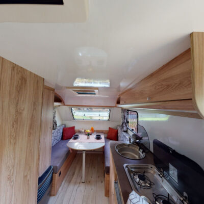 In het woongedeelte van de caravan staat een zithoek die om te bouwen is tot een tweepersoons bed, en in het achterste gedeelte staat een stapelbed. De caravan is voorzien van een toilet, een douche met boiler en douchebak en keukenapparatuur zoals een gasfornuis, koelkast en spoelbak.